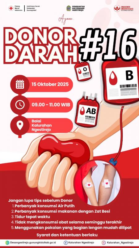 NGESTIREJO (SIDA Samekta). Pemerintah Kalurahan Ngestirejo bekerja sama dengan Palang Merah Indonesia (PMI) Kabupaten Gunungkidul, mengajak seluruh warga Kalurahan Ngestirejo dan sekitarnya untuk ikut berpartisipasi dalam kegiatan kemanusiaan. Kegiatan Donor Darah Rutin ini terbuka untuk seluruh warga masyarakat. Donor Darah akan dilaksanakan pada :